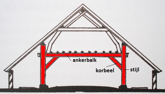 - De ankerbalk wordt meestal bij de stijl gesteund door een korbeel