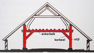 ankerbalkgebint; het rode deel is het ankerbalkgebint (het gebint boven de ankerbalk is een juk of jukkenkap): ![]() |