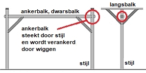 Omdat de ankerbalk dóór de stijl steekt en geborgd wordt door wiggen, wordt de