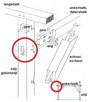 ankerbalkgebint; in de rode cirkel: de ankerbalk (dwarsbalk) steekt door de stijl en wordt aan de andere zijde van de stijl geborgd door houten wiggen (uit "historische houtconstructies in nederland" van g. berends, van tekst voorzien): ![]() |