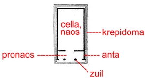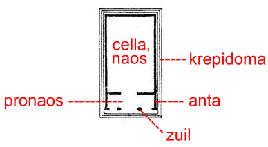 antentempel met cella (naos), pronaos, antae (anten), twee zuilen en krepidoma (afbeelding joostdevree): ![]() |