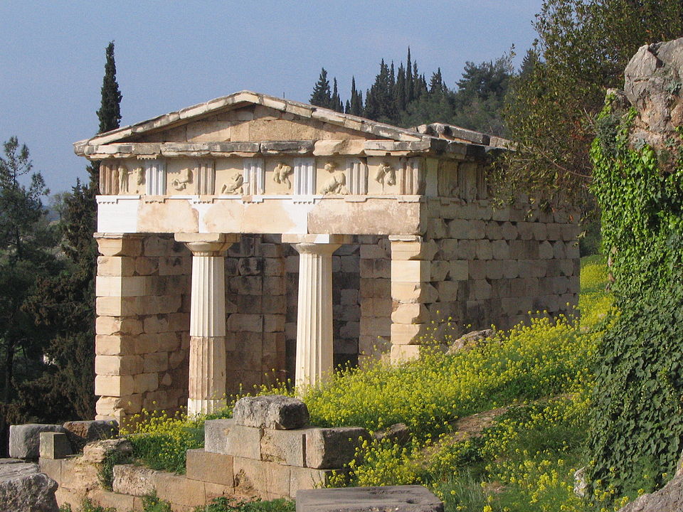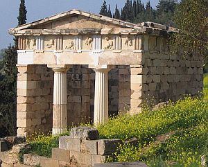 antentempel, schathuis atheners, delphi, griekenland; de anten zijn hier niet herkenbaar als zuilen, maar alleen als delen van de zijmuren; klik voor groter (napoleon vier, wikipedia): ![]() |