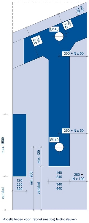 leidingen, sparingen; meestal voorgespannen; sparingen voor trapgat e.d.)