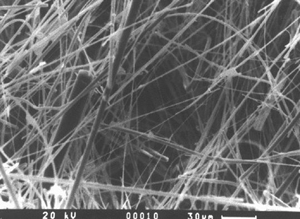 asbestvezels (het streepje onderaan is 30 micrometer): ![]() |