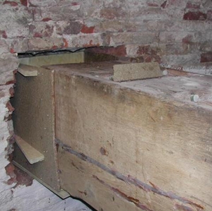 balkkop met omkisting aan drie zijden, waarschijnlijk voor een houtprothese met wapeningsstaven, anders is het draagvlak van de balk in de muur te gering (stichting de oude molen):![]() |