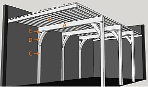 samengestelde balklaag met houtskelet (hier: muurstijlen, sleutelstukken, korbelen en moerbalken); samengesteld dus er zijn moerbalken; klik voor groter (tekening edwin orsel, uit sleutelstukken en consoles in leiden van e. orsel en i.s. van der spek, erfgoed leiden): ![]() A = moerbalk, B = kinderbalken, C = muurstijl, D = korbeel, E = sleutelstuk |