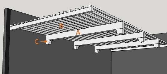 samengestelde balklaag op consoles; samengesteld dus hier zijn wel moerbalken; klik voor groter (tekening edwin orsel, uit sleutelstukken en consoles in leiden van e. orsel en i.s. van der spek, erfgoed leiden): ![]() A = moerbalk, B = kinderbalken, C = console |
