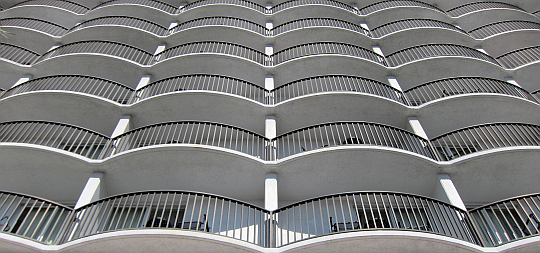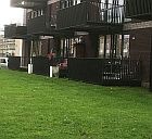 Een balkon dat op dezelfde verdieping doorloopt over alle woningen