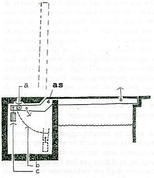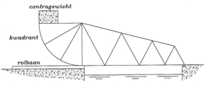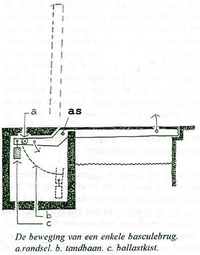 principe basculebrug, met as (as), rondsel (a), tandbaan (b) en ballastkist (c) (contragewicht) onder wegdek (bruggenstichting): ![]() |