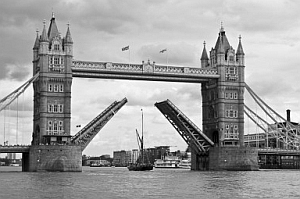 dubbele basculebrug, tower bridge, londen (de bovenste overbrugging is een vakwerk"brug", vernoedelijk om voor een stijvere constructie te zorgen): ![]() |
