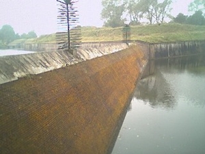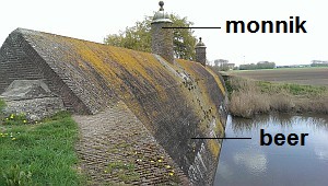 beer, hier met ezelsrug en een eigentijdse versie van een monnik, om het overlopen van de beer te bemoeilijken; waterkering naarden (foto p. duinker) ![]() |