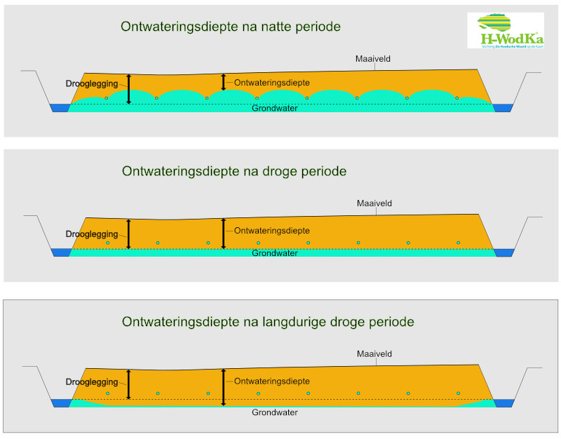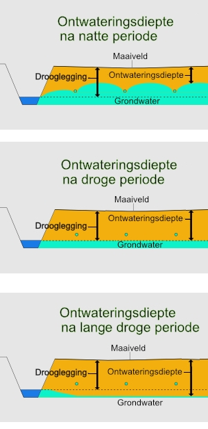 de drooglegging is onveranderd, terwijl de ontwateringsdiepte wisselend is na natte periode, droge periode en langdurige droge periode; een natte periode wordt gekenmerkt door een "opbolling" van het grondwater; klik voor de volledige afbeelding (de hoekse waard): ![]() |