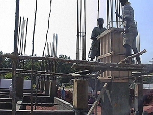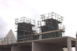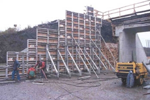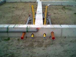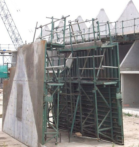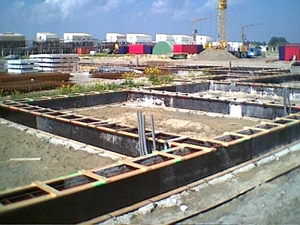 Bekisting met veel zogenaamde pielmannetjes om de juiste afstand te houden (door de druk van het beton kan de bekisting wat gaan wijken). ![]() |