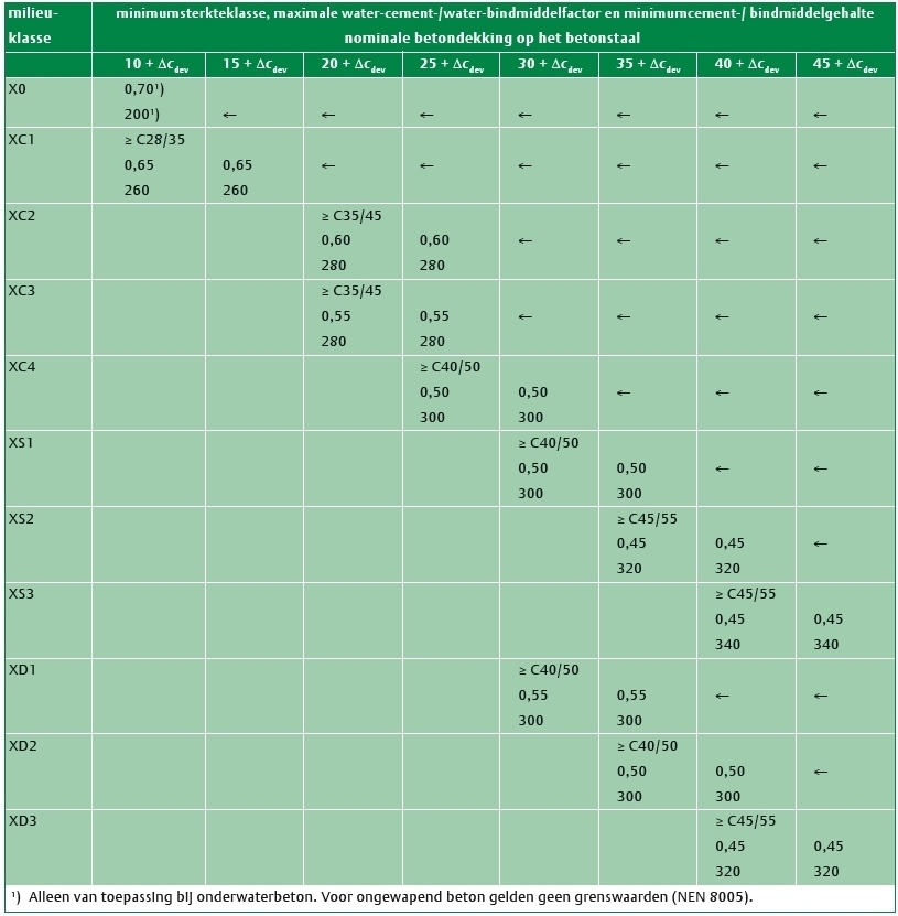 Voor de betondekkingen zie de tabel hieronder; bijvoorbeeld bij milieuklasse XS2 kan een nominale betondekking horen van 40+5 = 45 mm indien de sterkteklasse van het beton >= C45/55 is.
