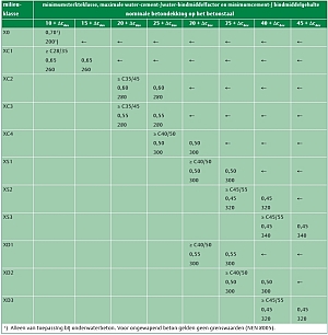 tabel met milieuklasse (rijen in de tabel) en betondekking (kolommen in de tabel) bij verschilende sterkteklasses, uitgaande van 50 jaar ontwerplevensduur en bescherming tegen corrosie van het betonstaal; ook o.m. de watercementfactor wordt gegeven (volgens eurocode 2; met dank aan cement&betoncentrum); klik voor groter! ![]() |