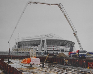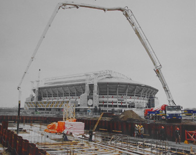 De betonpomp laat bijvoorbeeld de fundering snel vol lopen met verse beton,