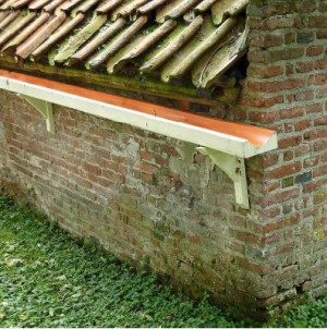 of klampen; de blokgoot staat op deze manier meestal net buiten de muur zodat de
