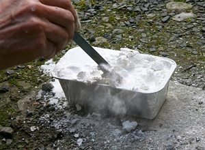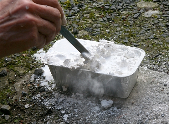 nat blussen van gemalen luchtkalk op kleine schaal; let op het spatten (onroerend erfgoed):![]() |