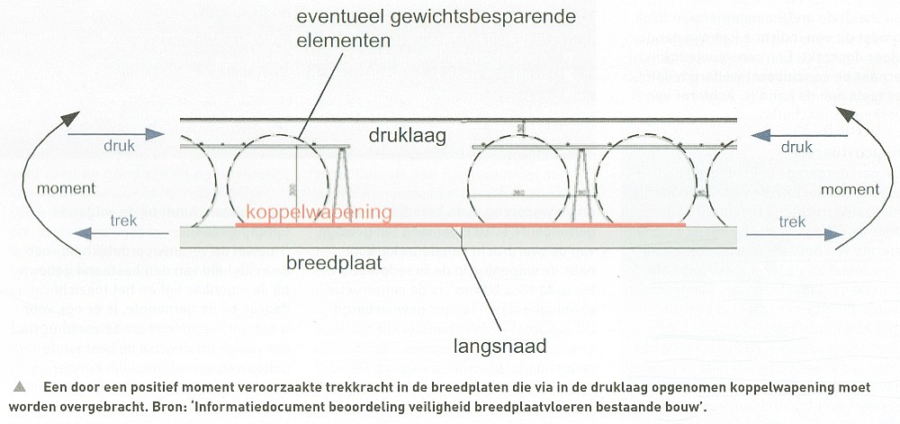 toevoegen koppelwapening; koppelwapening is vereist bij de overgang tussen twee breedplaatvloeren, vooral bij gewichtsbesparende elementen (informatiedocument beoordeling breedplaatvloeren bestaande bouw, via bouwtotaal); klik voor groter! ![]() |