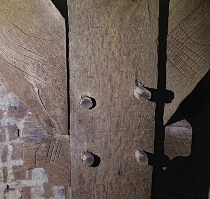 (...) De klosjes bevinden zich alleen bij de aanzetten van de windschoren en de meest waarschijnlijke verklaring is dat de pengaten voor de windschoren extra groot waren gemaakt om bij het oprichten de windschoren makkelijker met een draaiende beweging in de pengaten te kunnen schuiven. Nadat de schoren waren gemonteerd werd het pengat opgevuld met dit borgklosje om te voorkomen dat de windschoren door de krachten in de kap alsnog in het pengat naar beneden zouden kunnen schuiven."