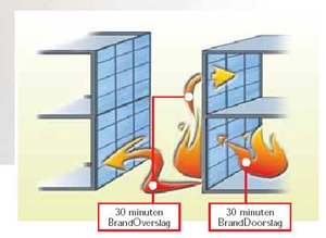 brandoverslag en branddoorslag; klik voor groter: voorbeeld van brandoverslag en branddoorslag; rechts doorslag (naar buiten) en overslag (naar andere ruimte in zelfde gebouw) links overslag (naar een ander gebouw): ![]() |
