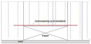 zicht van boven: koppelwapening (dwarswapening) bij een trapgat in een woning; klik voor groter (adviesbureau hageman): ![]() |