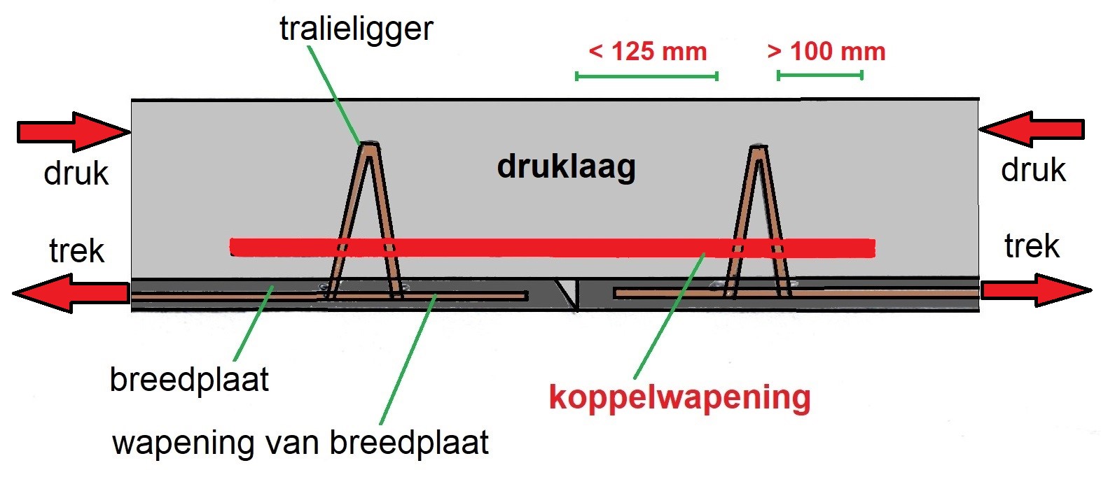 De koppelwapening dient minimaal 100 mm voorbij de eerste tralieligger vanaf de plaatrand te liggen, zie de afbeelding verderop.