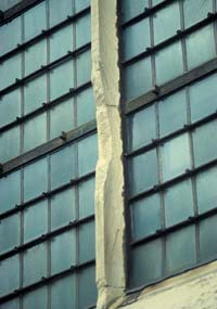 De eerste afbeelding toont een detail van een glas-in-loodraam met brede brugstaven en dunnere horizontale bindroeden. De verticale natuurstenen montant (stijl, post) in het midden is gebroken door uitzetting van de roestende brugstaaf (foto R. Crèvecoeur, Cultureel Erfgoed).
