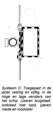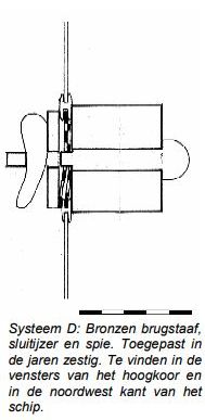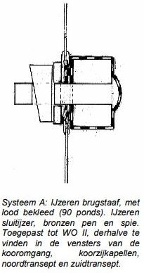 "drie typen brugstaafconstructies, toegepast gedurende de restauratiecampagne van 1904-1969 [van de grote of onze lieve vrouwekerk in breda](tekening architectenburo j. van stigt bv)": ijzeren brugstaaf, met lood bekleed, bronzen pen en spie: ![]() |