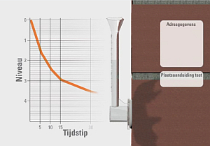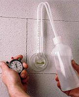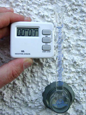 - men leest en noteert na 5, 10 en 15 minuten het waterniveau in de glazen buis (meetnauwkeurigheid van de streepjes is 0,1 ml)