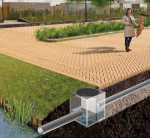| waterdoorlatende bestrating én waterberging door speciale ondergrond én afvoer teveel aan water naar riool; porodrain systeem (mbi, de steenmeesters):   |