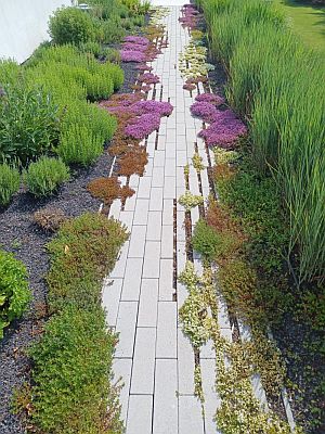 | waterdoorlatende bestrating met verschillende breedtes van stenen waardoor een wat smaller, maar bij slecht weer toch goed begaanbaar pad overblijft (marlux):   |