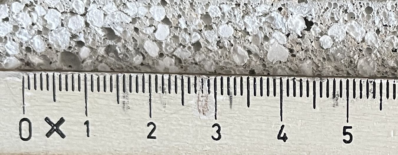 structuur van c-eps isomix plus; oppervlakte van een veel-in-de-handen-gehad-sample met eigen meetlat; de korrels zijn ca. 2-3 mm groot (foto joostdevree): ![]() |