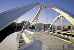 1984-1987: bach de roda - felipe ii brug in barcelona, spanje, een uitzonderlijke boogbrug, stoer maar slank, het voetgangersdeel aan de randen van de brug waaiert speels uit, de brug is een voorbeeld van het feit dat aan de onderzijde van de constructie het materiaal en de vorm robuuster is dan de hoger gelegen delen (foto bridges of the world): ![]() |