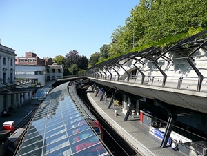 1983-1990: bahnhof stadelhofen in zürich, zwitserland, verbouwing van een treinstation uit 1894, schuine pilaren (gaudí-achtig) voor het nieuwe deel dat het talud met bomen draagt, het grijze beton doet wel goedkoop aan, maar de rondingen maken het geheel vriendelijker en er kan veel daglicht toetreden door grote geronde muuropeningen en door de glazen luifels boven de perrons (foto metro centric): ![]() |