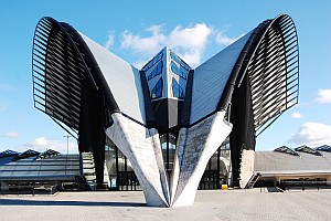 1989-1994: tgv-station luchthaven lyon saint-exupéry (oorspronkelijk lyon-satolas): uitzonderlijk fraai ontwerp, plattegrond heeft de vorm van een vogel die op het punt staat op te vliegen (lijkt ook op een pijlstaartrog met de vinnen naar boven), de bouwelementen doen denken aan een geraamte of een borstkas, futuristisch ontwerp, exterieur is 's avonds in bijzondere kleuren staalblauw en zeegroen (foto teematoe; discl.): ![]() |