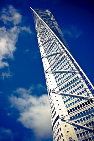 1999-2004 turning torso, malmö, zweden, hoogbouw in spiraalvormig, negen blokken met elk vijf verdiepingen draaien uiteindelijk een kwart slag, een stalen steun over de volle hoogte maakt er één geheel van, een diagonaal en een horizontaal als windverband per blok geeft extra aan dat elk blok bevestigd is aan die ene as, door per verdieping een kleinere stang aan de as te bevestigen lijkt de as op een gedraaide ruggengraat (vandaar het geheel als "turning torso"), er is een inwendige kern met liften en trappen, op elke verdieping zijn er één tot vijf appartementen, calatrava maakte gebruik van prefab bouwelementen waardoor de bouw versneld werd, mooi voorbeeld van techniek en architectuur (foto el plan b arquitectura): ![]() |