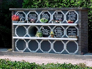 columbarium in de vorm van een urnenmuur, in de buitenlucht (foto liske rynja, begraafplaats.org): ![]() |