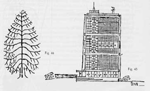 le corbusier, tekening van een boom als voorbeeld voor het organisme van een gebouw: ![]() |