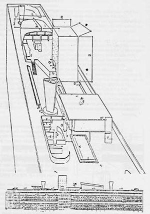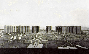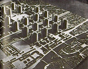 [Kritische noot: Een duidelijk model voor de geestdodende, onmenselijke Bijlmermeer-achtige wijken waarvan er zo veel gebouwd zouden worden, maar gelukkig ook vele al zijn afgebroken!]