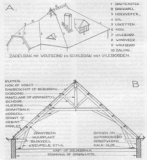termen: ankerbalk, ankerbalkgebint, balkslof, bebording, binnenboeiboord, blokkeel, boeiboord, borstwering, buitenboeiboord, dakbeschot, dakkapel, dakspar, dakvenster, dekbalk, dekbalkjukspant, dekbalkspant, draaghout, fliering, gebint, gebintbalk, gebintkoppelplaat, gording, hanebalk, hoekkeper, hoofdbalk, jukbeen, jukplaat, jukdekbalk, kapbalk, kil, koningsstijl, korbeel, kreupele stijl, loket, loketten, makelaar, muurplaat, naald, neut, nok, nokbalk, panlat, poer, ruiter, schilddak, schoor, spanning, spant, spantbalk, spantbeen, spanwijdte, spoor, stijl, stijlzool, uilebord, uilenbord, vliering, vorst, windschoor, windveer, wolfseind, zadeldak, zaling, zolderbalk, zolderligger