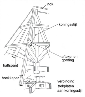 termen: nok, koningsstijl, halfspant, aftekenen gording, hoekkeper, verbinding trekplaten aan koningsstijl.