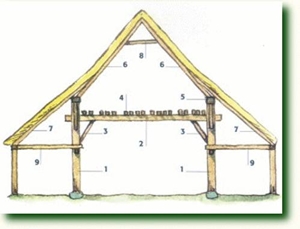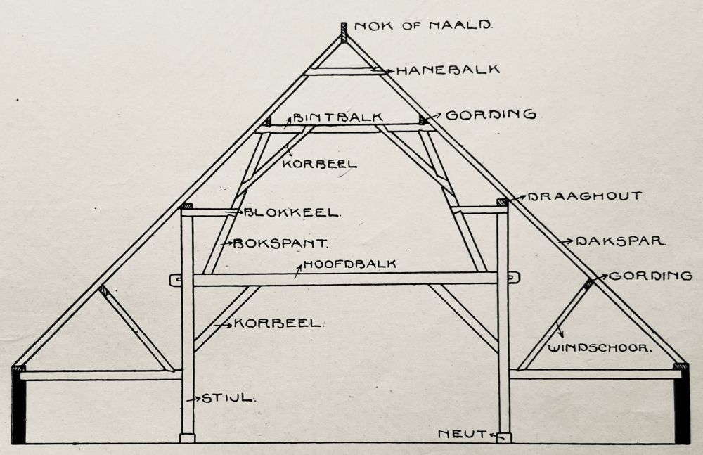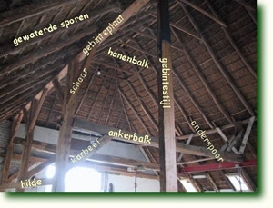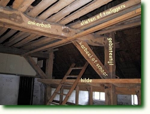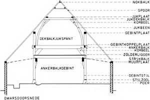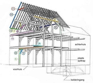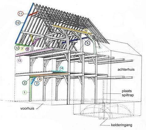 1. muurstijl 2. korbeel 3. sleutelstuk 4. moerbalk 5. spantbeen 6. tussendekbalkjuk 7. windschoor 8. worm, fliering 9. korbeel 10. spoor, spar 11. haanhout 12. muurplaat 13. strijkbalk 14. kinderbintentermen: voorhuis, achterhuis, spiltrap, kelder, kelderingang |