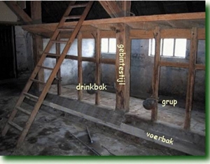 termen: ankerbalk, sliet, slieten, tasligger, tasliggers, gebintstijl, korbeel, schoor, hilde, drinkbak, grup, voerbak, spoor, sporen, gewaterde sporen, schoor, hanenbalk.