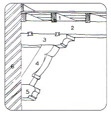 1. kinderbalk 2. moerbalk 3. sleutelstuk 4. korbeel 5. draagsteen 6. muur |