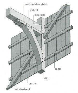 termen: moerbalk, korbeel, moerbalk, sleutelstuk, peerkraal, peerkraalstuk, regel, stijl, beschot, windverband.