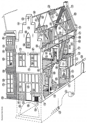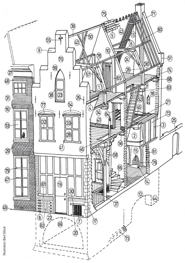 Bouwkundige termen bij een "oud huis" (klik voor groter; tekening Bart Glück):