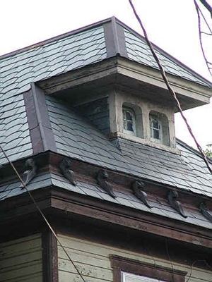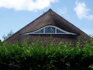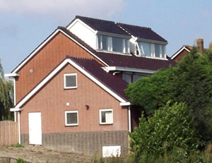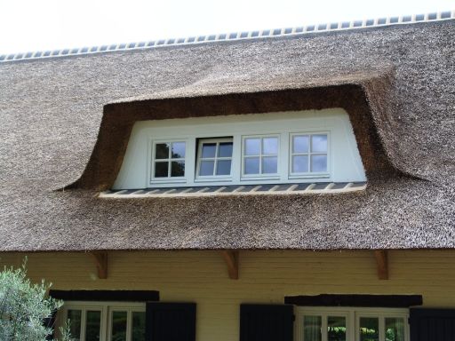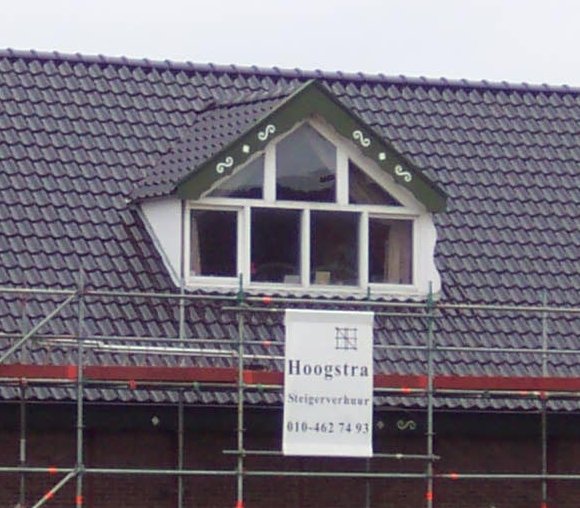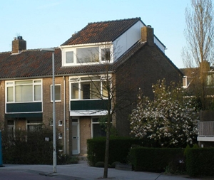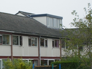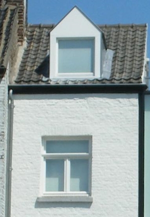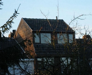 uiterst onhandig (alleen daglicht door dakvensters in zeer flauw hellend dakvlak; geen "normaal" uitzicht naar buiten) en uiterst lelijk verlengd dakschild (hoe kan een gemeente zoiets toestaan of is het wellicht ooit door de gemeente verplicht omdat er al zo'n gedrocht in het rijtje huizen was?; in ieder geval zijn links op de foto gebruikelijke dakschild- of nokverhogingen zichtbaar): ![]() |