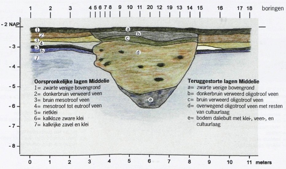 - bevat een 3,5 à 4 m dikke verstoorde veenlaag (in een gebied met autochtone veendikte van slechts 1,5 m)
