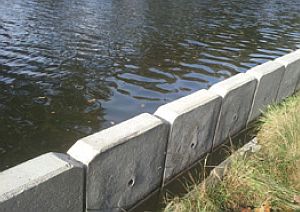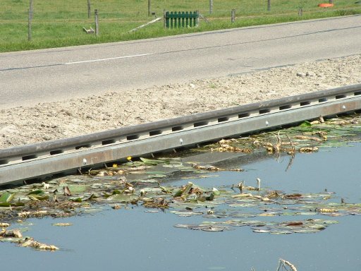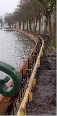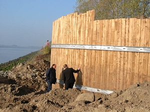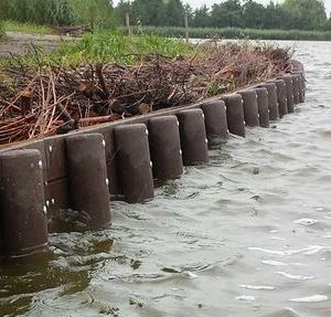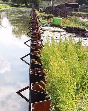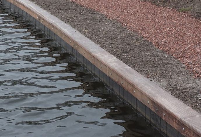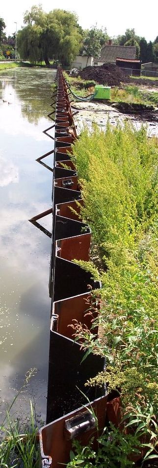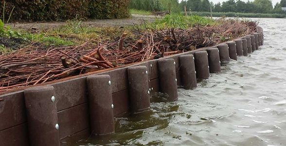 | Zelfs als je echt geen milieufanaat bent moet je erkennen dat in landelijke gebieden betonnen, stalen, zeer zeker licht gekleurd kunststof en ook wel hardhouten damwanden als oeverbescherming ontsierend zijn. Daarbij komt dat de damwanden voor dieren vaak te hoog en te glad zijn om de oevers te bereiken. Tegenwoordig worden op veel plaatsen, binnen een lange oeverstrook, zogenoemde groene of natuurvriendelijke oevers aangelegd. Deze oevers bieden de dieren paai-, opgroei-, leef- en overwinteringsplaatsen. En het is een fraaier gezicht... Een wat fraaiere oplossing voor een beschoeiing is te zien op de foto hieronder (van Saveplastics). De  wrijfgording bestaat uit een stalen UNP-180 en een kunststof recycling inleggording.  |